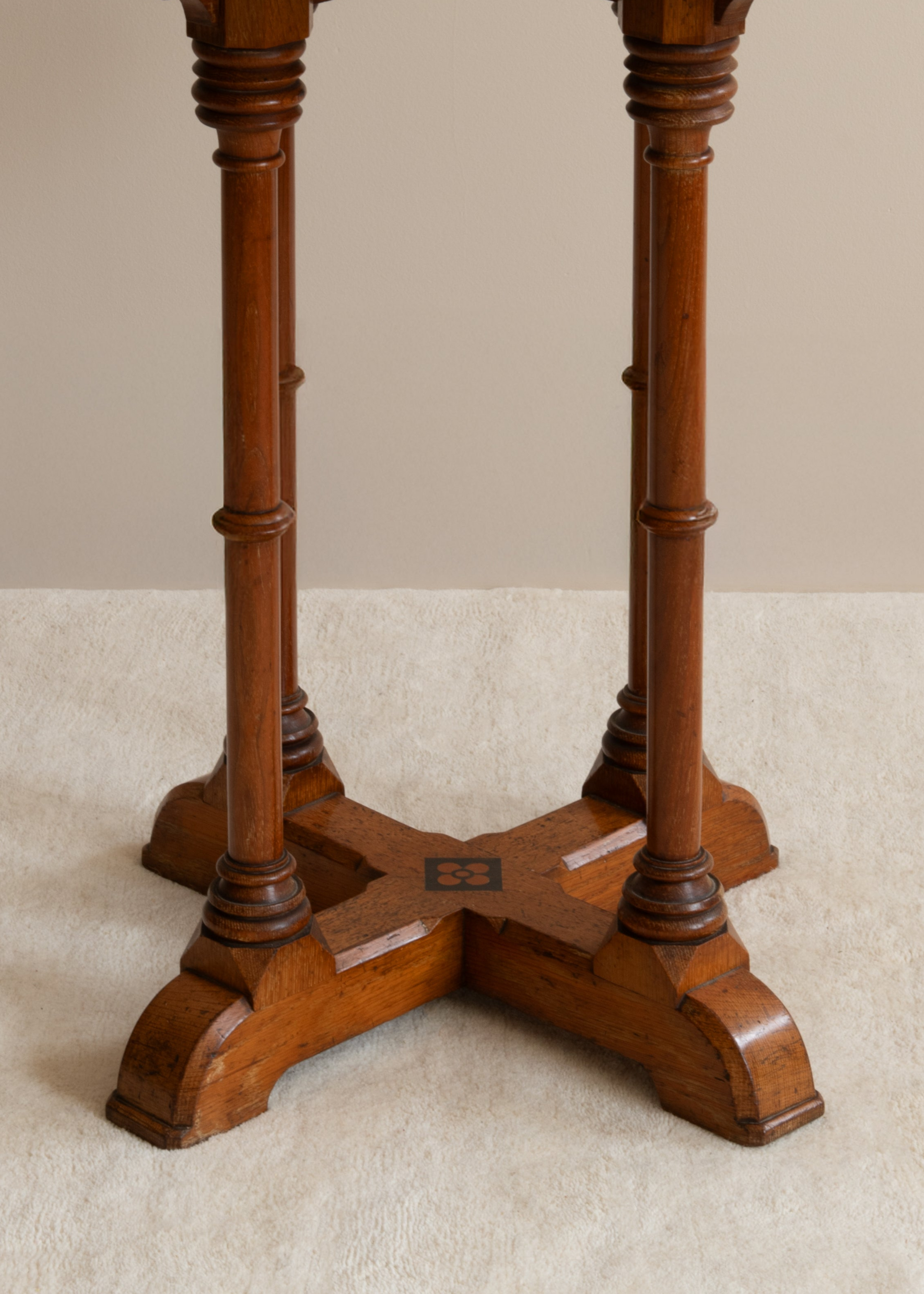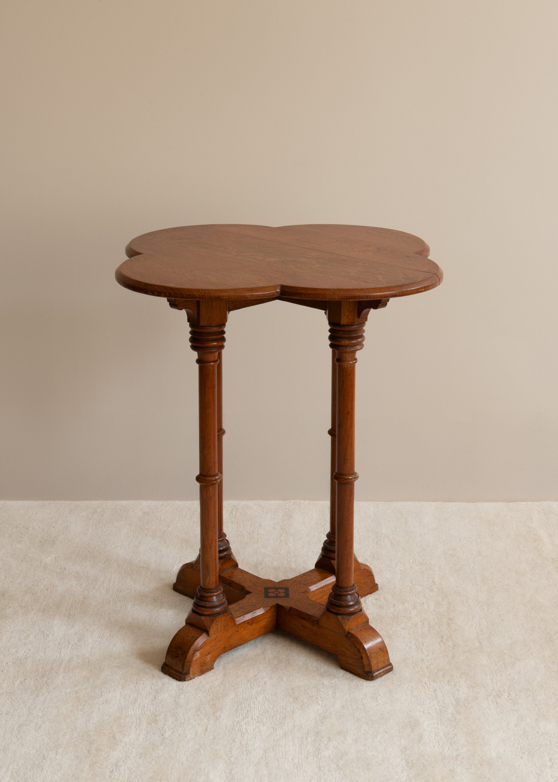 Made from oak, with beautifully carved legs and four leaf clover detail at the base.