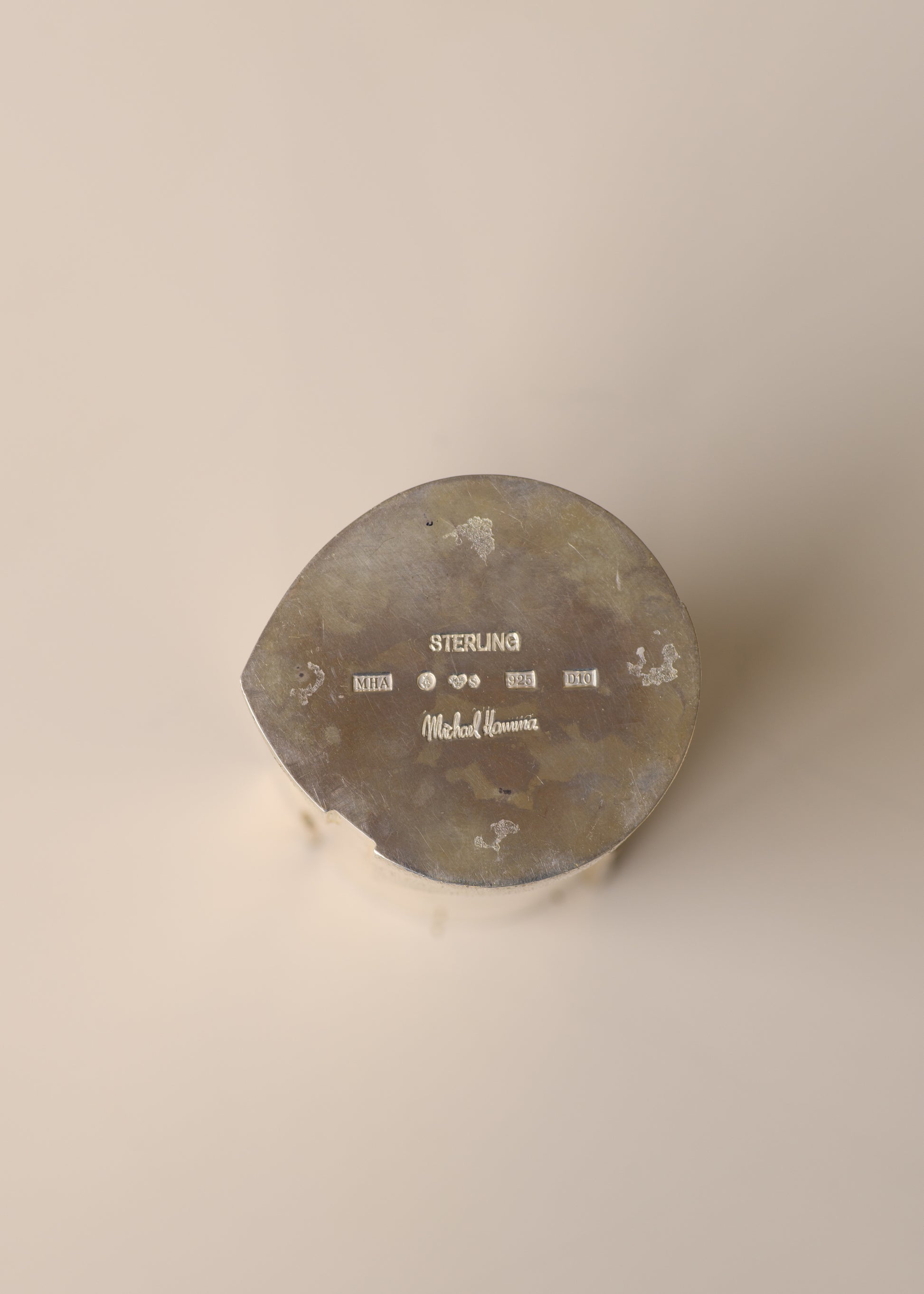 The underside bears the artist's initials along with silver hallmarks.